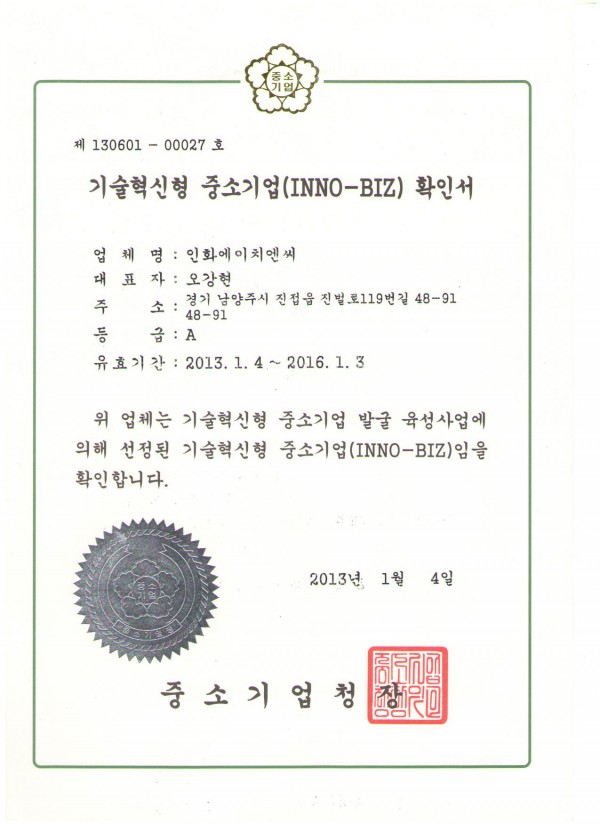이노비즈확인서 > 인증서